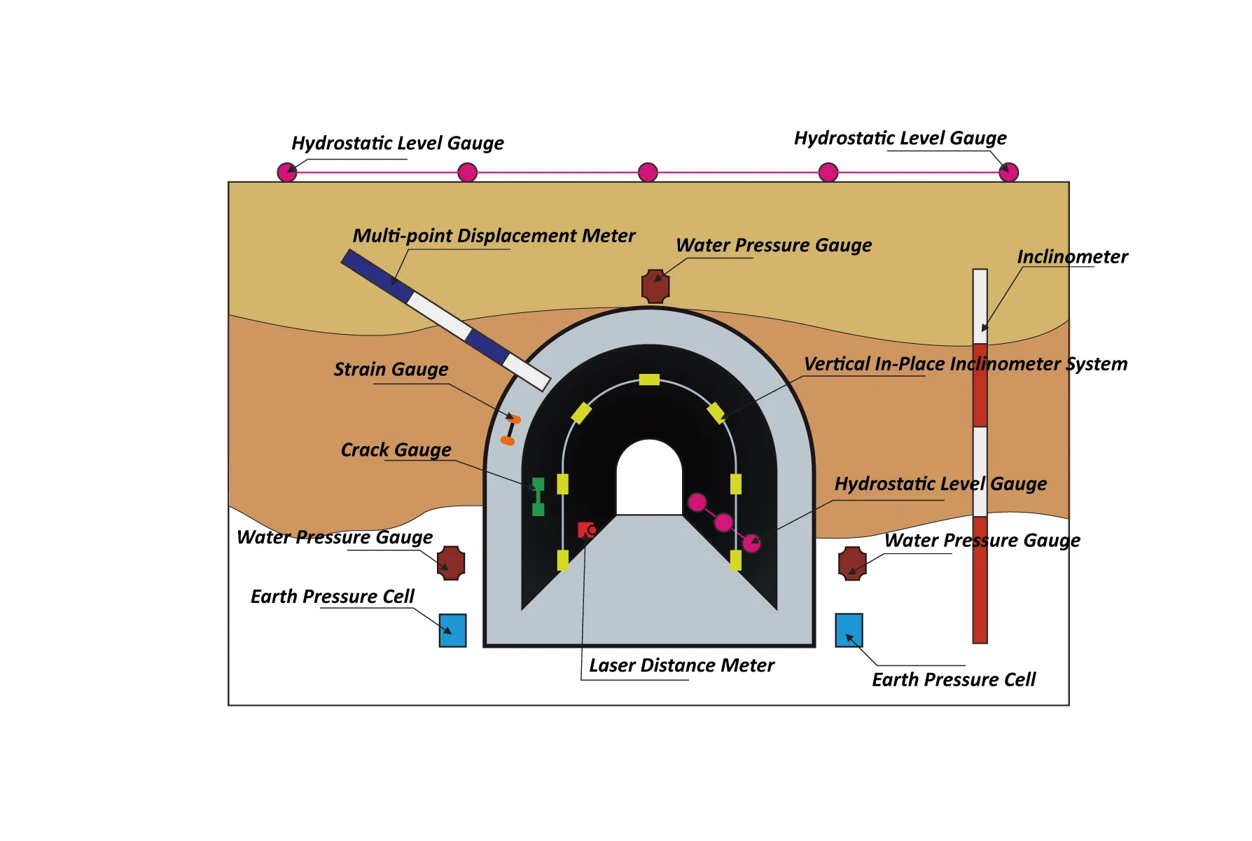 Alagúttelepülés, konvergencia-monitoring, alagútrepedés, szerkezeti alakváltozás-monitoring stb.